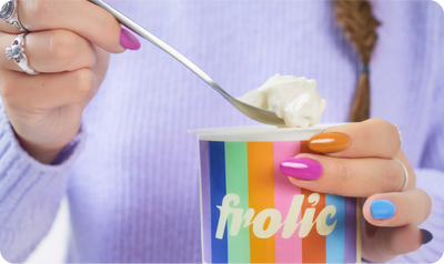 Meet our Classic Vanilla, a delicious canvas for any tasty creation! Made with grass-fed, organic ingredients, our Frolic Classic Vanilla creates a rich, one-of-a-kind vanilla taste that’s anything but plain. Grab the sprinkles, the chocolate chips, the fruit and enjoy!